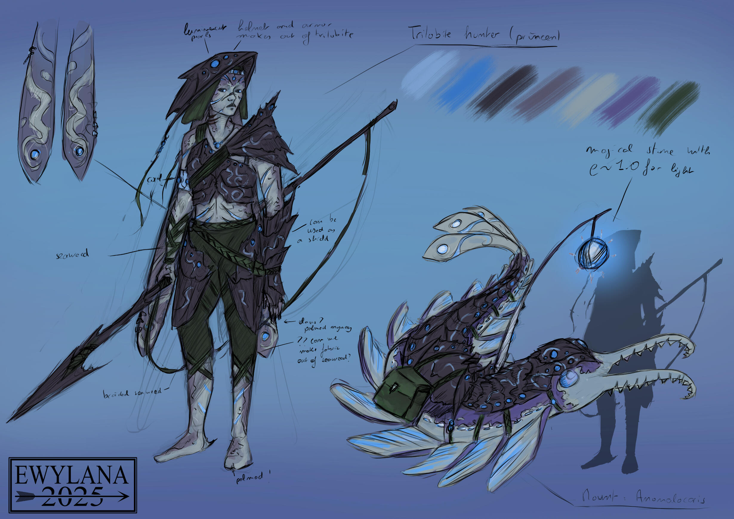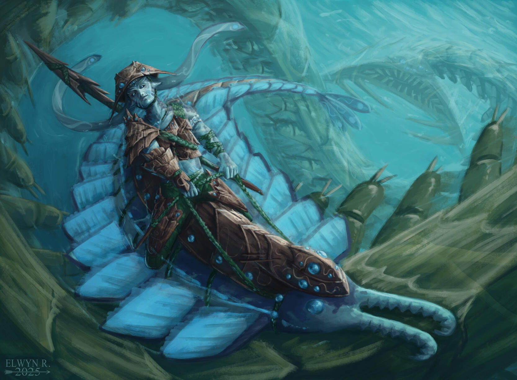 This artwork was created during Paul Scott Canavan’s Mastering Imaginative Realism Bootcamp. The brief was to create a piece in the style of a Magic: The Gathering hero's card, depicting a character and their animal companion within the theme of 'The Great Hunt'. I chose to depict strange merfolk in a world inspired by Cambrian fossils.