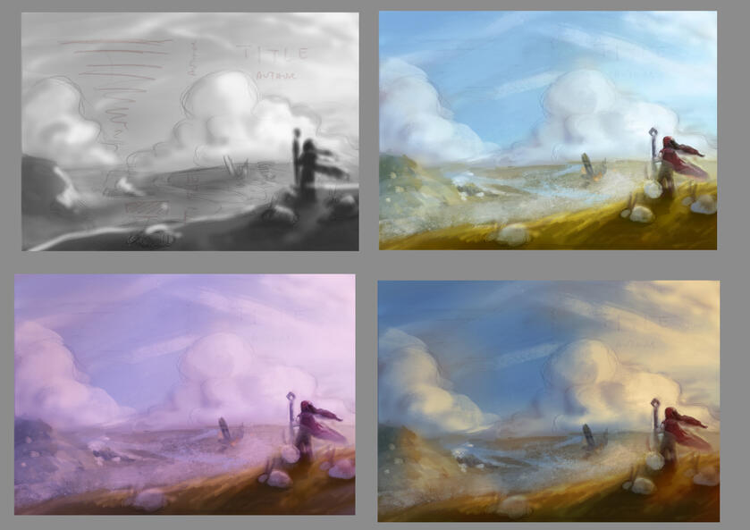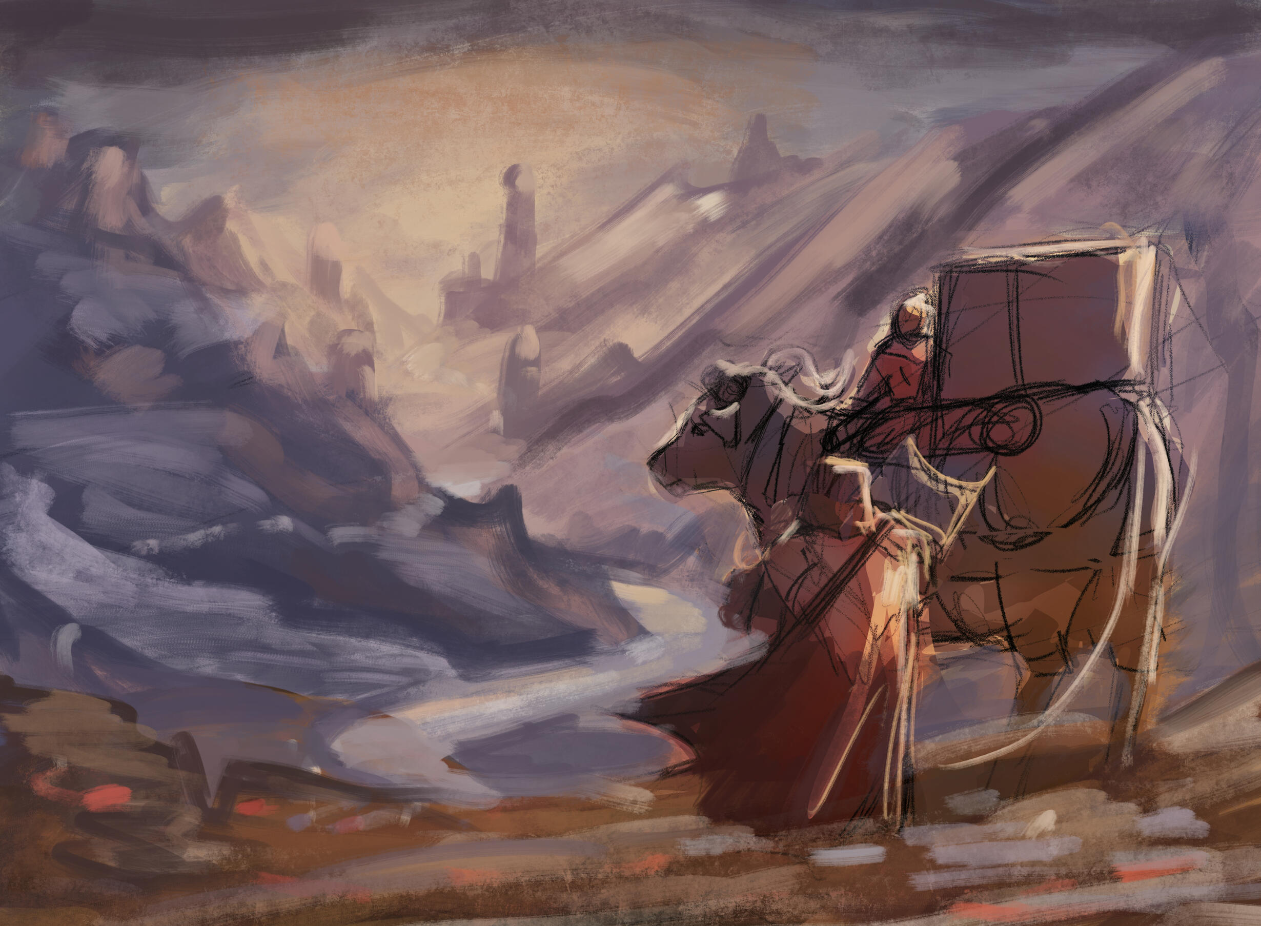 Illustration focused on the landscape, may figure a character but silouhetted and small.