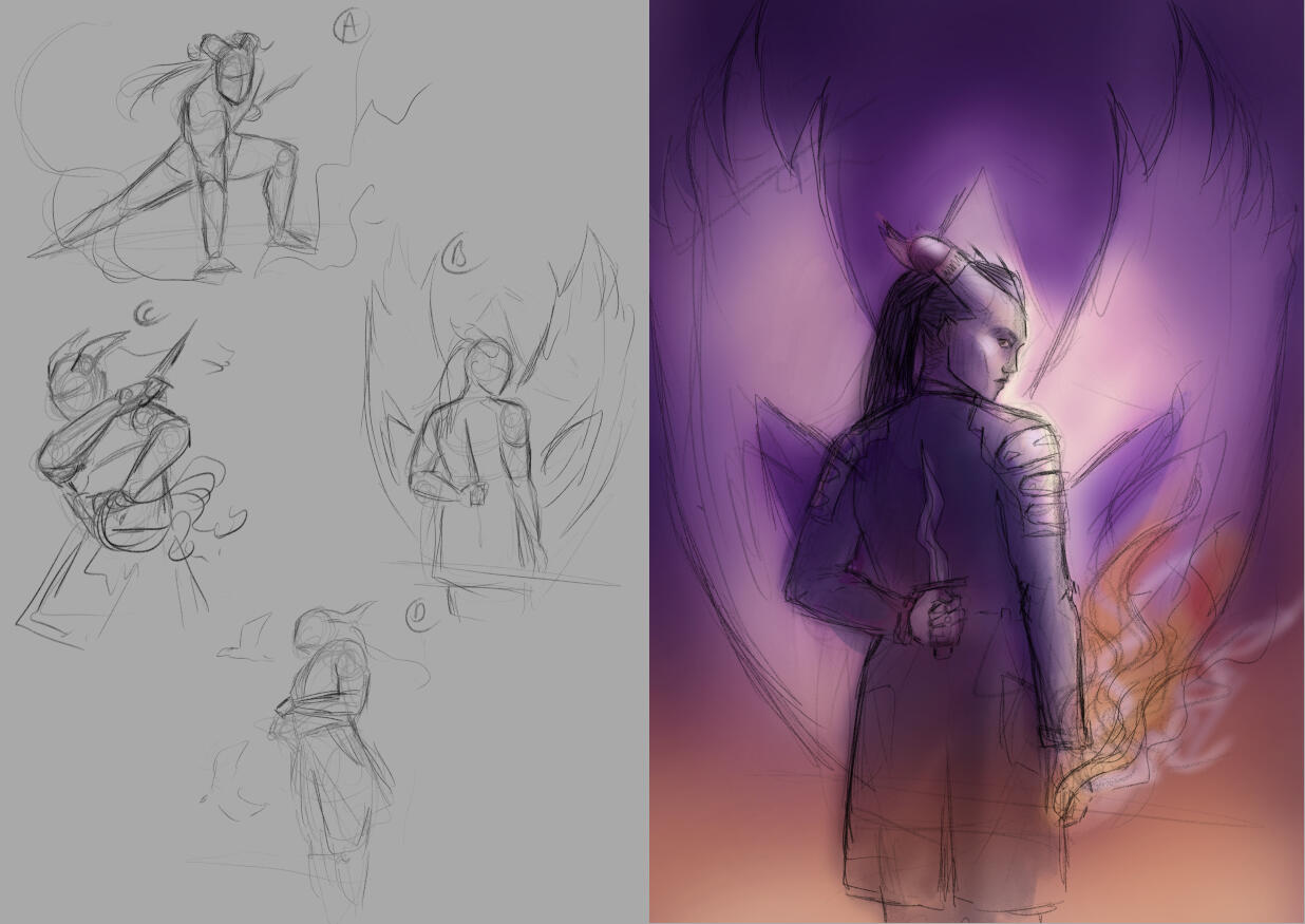 You will have a choice of two composition sketches. The character will be depicted in halfbody (up to hips) and a simple background can be included (e.g. flames, clouds, sea or mountains etc. ).