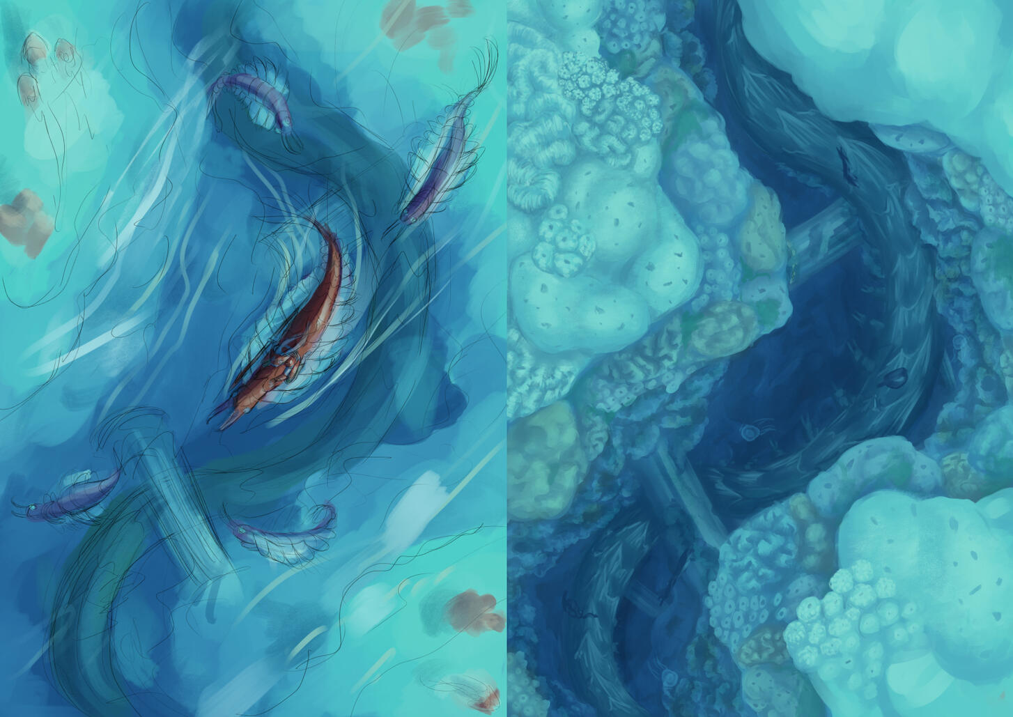 After working on a strange mermaid riding cambrian creatures for MIR bootcamp, I wanted to go back to this concept. I choosed to do a more environemental focused and peaceful piece, more like an introduction to the story told by my other piece. It was the occasion to revisit the mermaid and her mount design too, pushing for stronger colors.